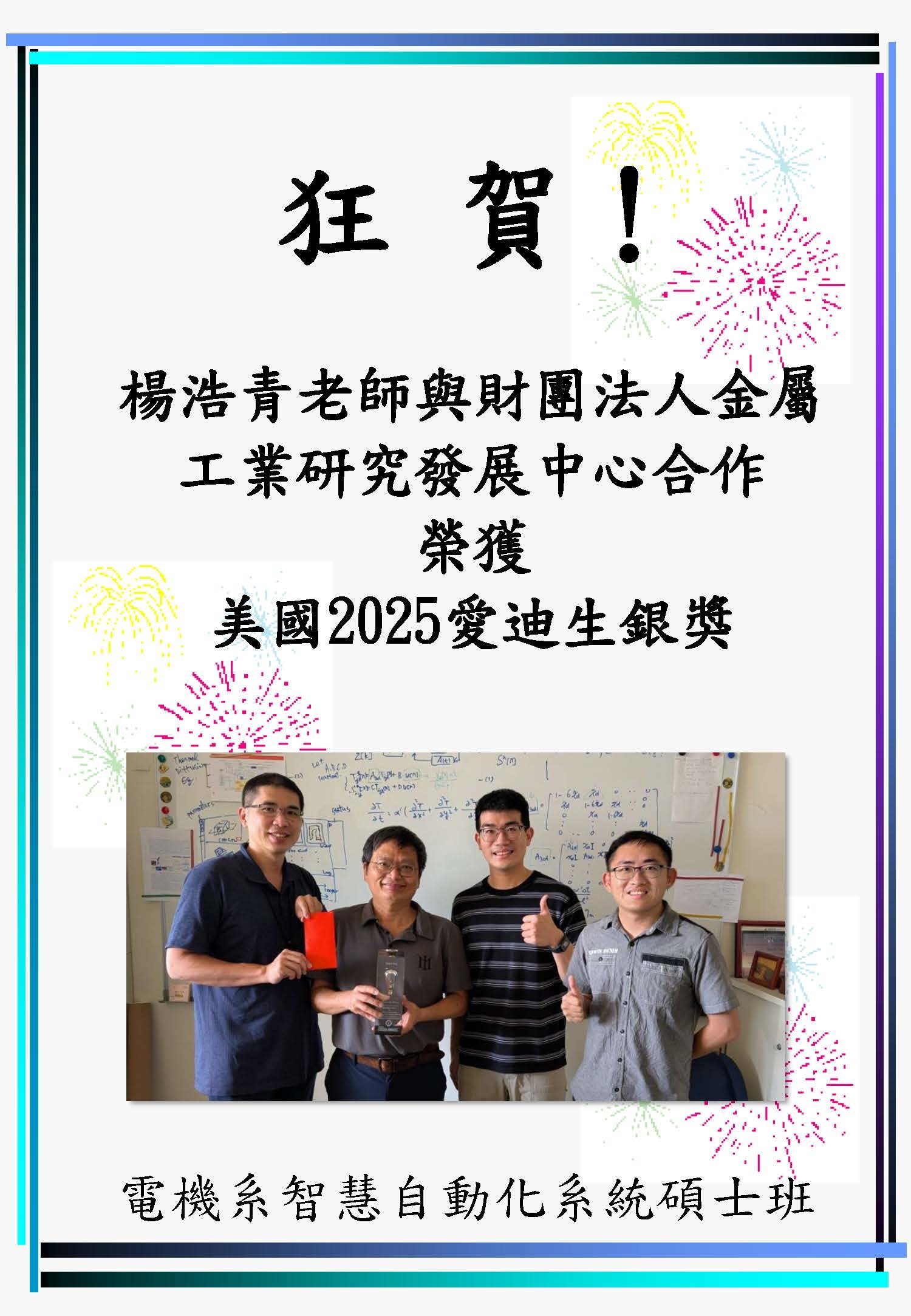 狂賀~楊浩青老師與財團法人金屬工業研究發展中心合作,榮獲美國2025愛迪生銀獎。